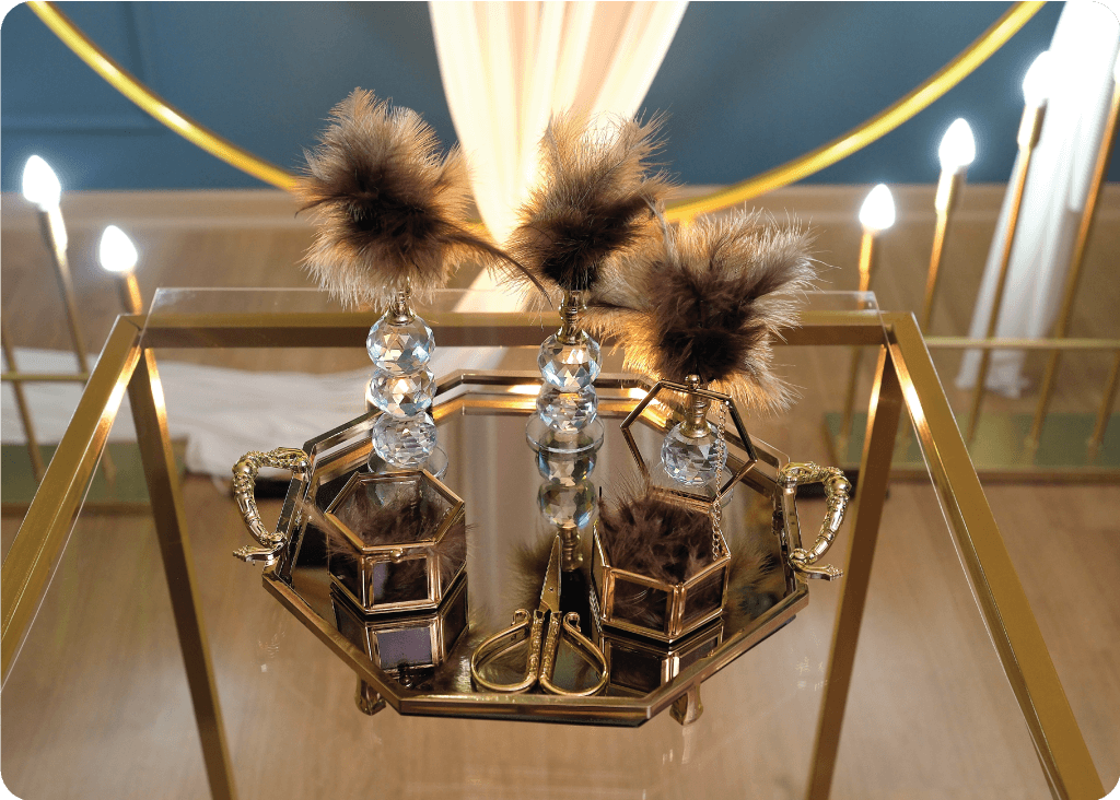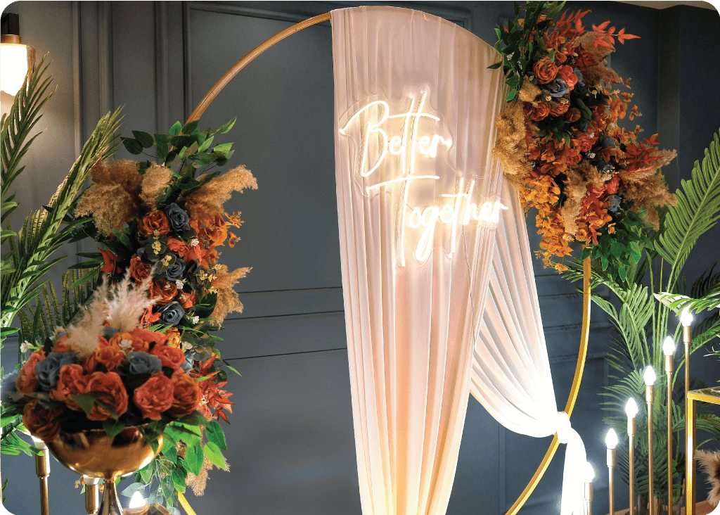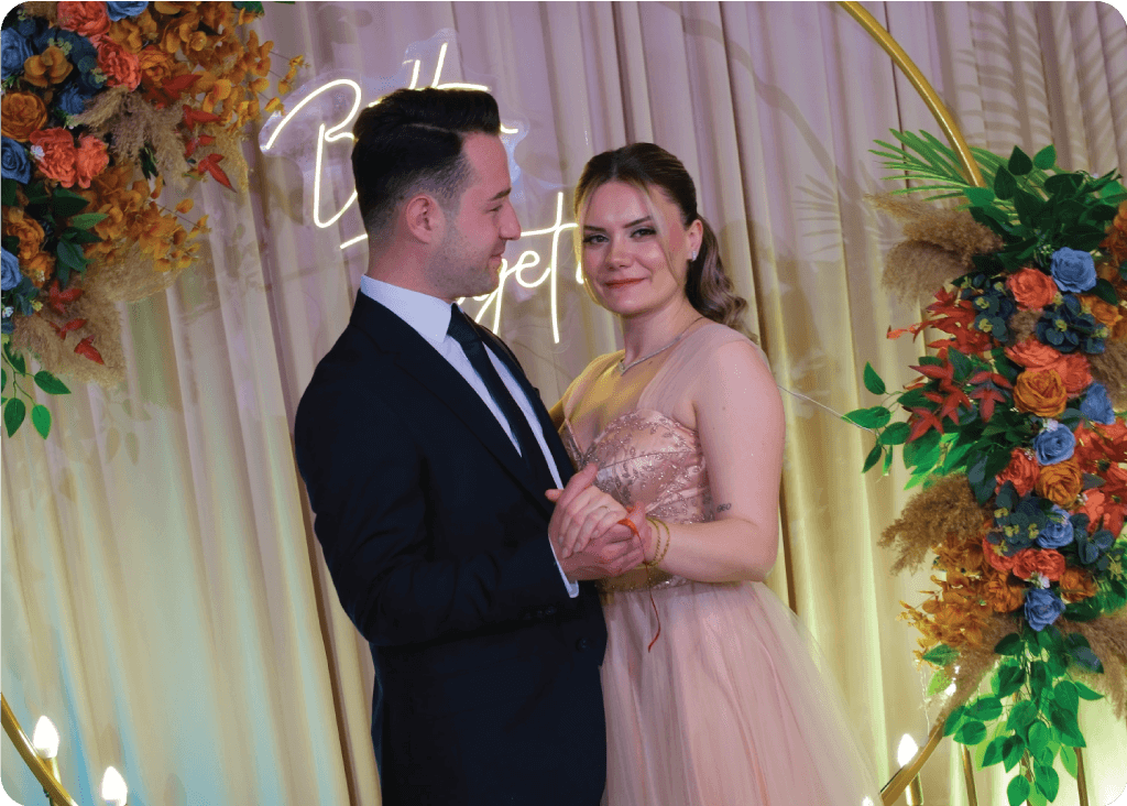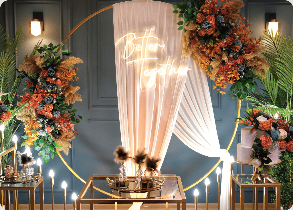 Havana Summer, altın halka formunu tül drape, sıcak ışık geçişleri ve canlı çiçek kompozisyonlarıyla birleştiren, mekâna anında enerji ve premium görünüm kazandıran konsepttir. Evde nişan ve evde söz organizasyonlarında fotoğraf çekimleri için güçlü bir odak noktası oluşturur.